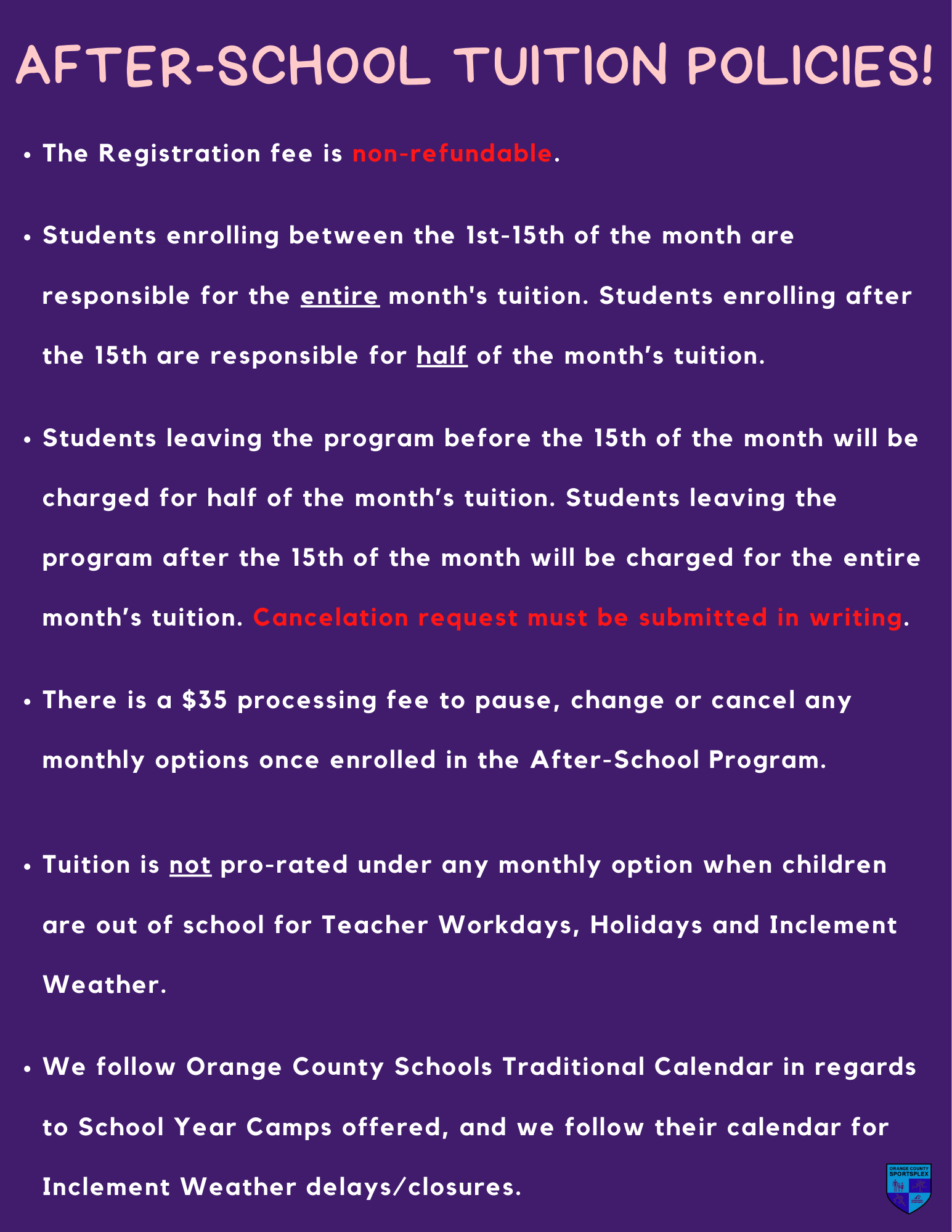 📅 We follow the Orange County Schools Traditional Calendar for After-School Care and School Year Camps.