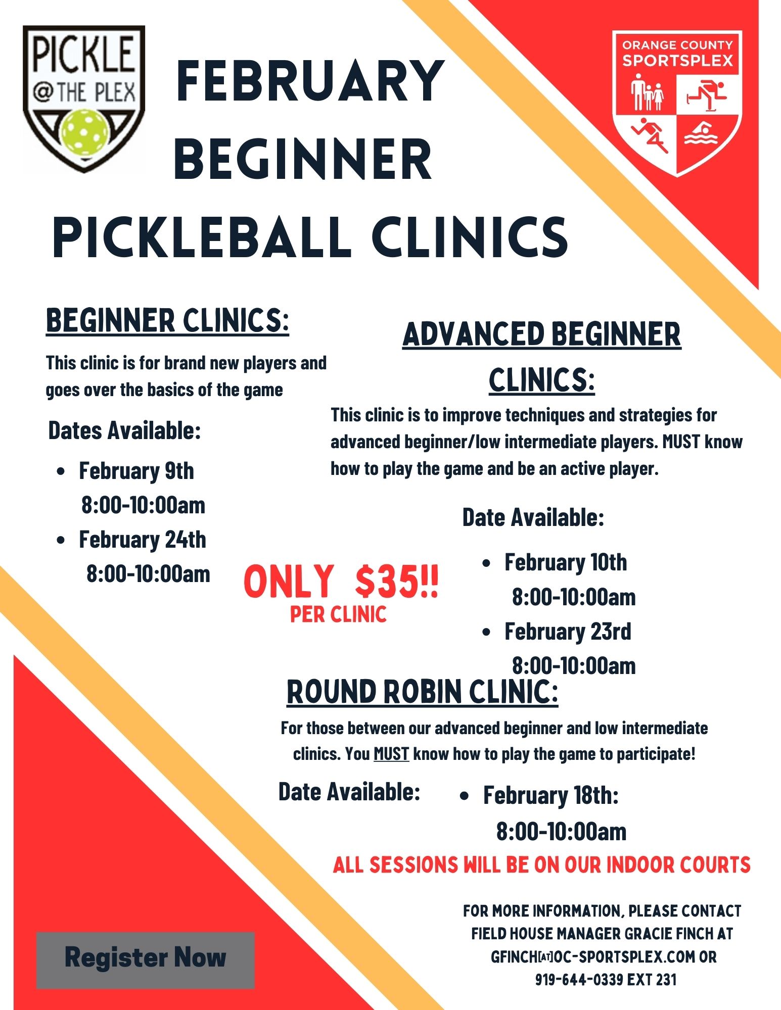 For help with registration, please contact Field House Manager Gracie Finch