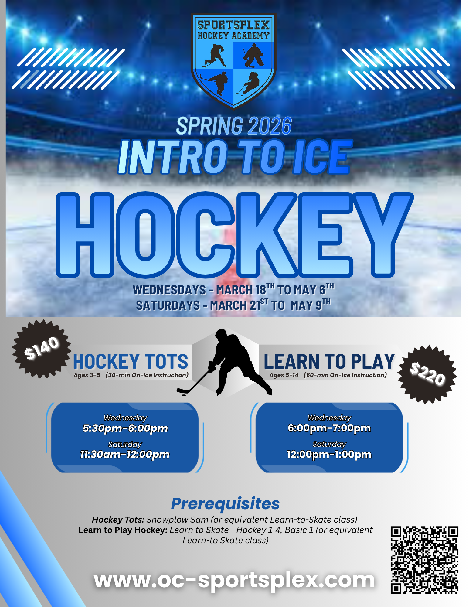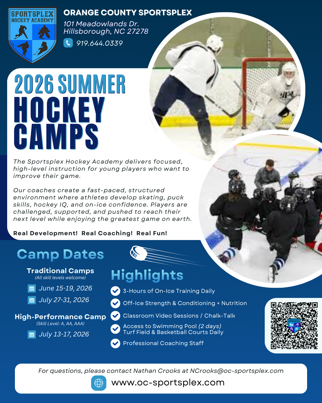 The Orange County Sportsplex offers a variety of youth hockey classes, clinics, and camps through our Sportsplex Hockey Academy. We aim to teach kids (and adults) how to play the game of hockey with hustle and sportsmanship. We work hard at improving skills, but also put a big emphasis on HAVING FUN! The staple of our Hockey Academy are the Intro to Hockey Classes on Sunday afternoons, including Hockey Tots for ages 3 to 6 at 3:45pm and Youth Learn to Play Hockey for ages 5 to 12 at 4:15pm. We run 7 to 8 weeks sessions throughout the year – more information, along with online registration can be found on this page.